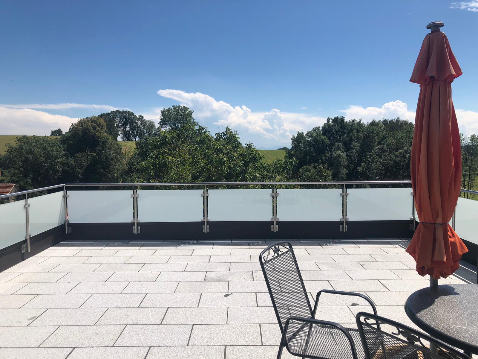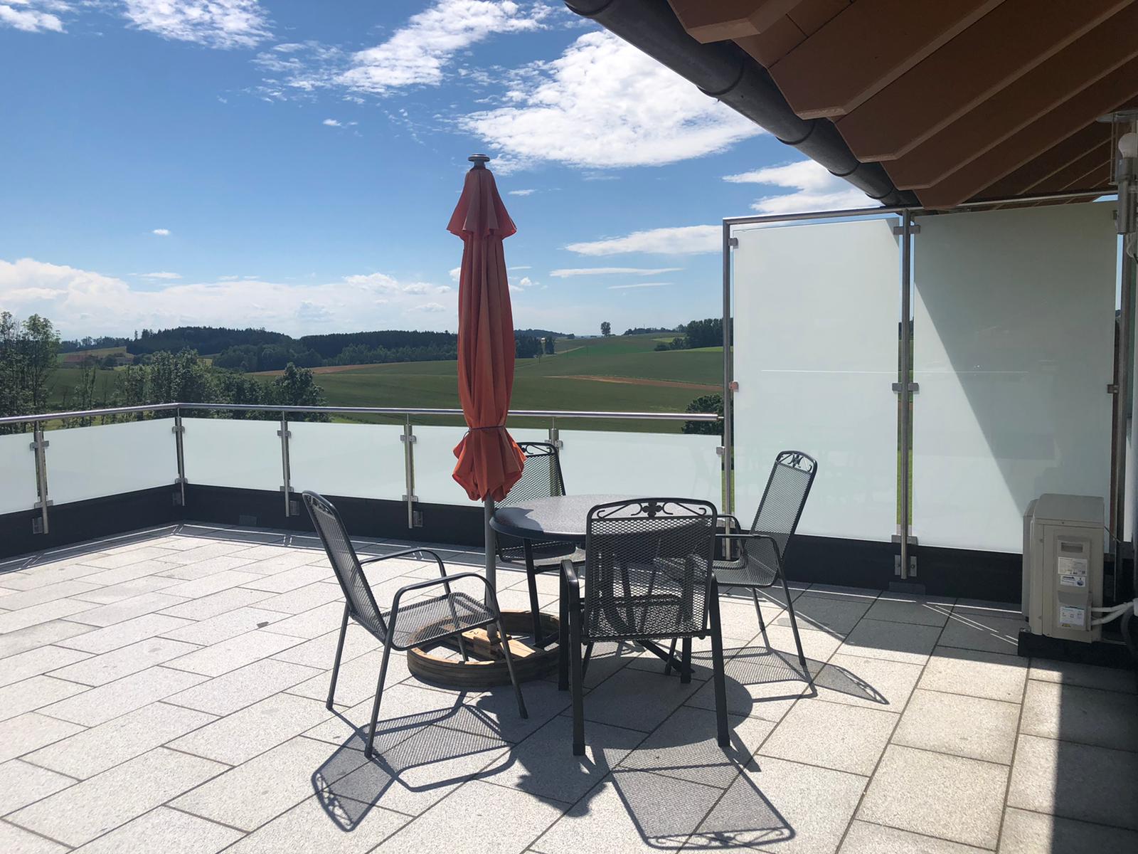 Zu guter Letzt und zum Highlight dieser einzigartigen Ferienwohnung – die Dachterrasse. Hier lässt es sich wunderbar entspannen. Geniessen Sie die Ruhe und die Aussicht über Wiesen, Felder und Wälder. Sehen Sie in der Ferne das Nachbardorf und erhaschen Sie bei Föhnlage einen zauberhaften Blick auf die bayerische Alpenkette. Der Grill lädt zum gemütlichen Beisammensein mit anschließendem Genuss auf der Gartentischgruppe ein. Diese Wohnung wurde von uns gut durchdacht und man kann hier seine Zeit in vollen Zügen auskosten.